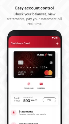 Amfanin ku bai taɓa kasancewa a bayyane haka ba. Dubai First yana baku damar samun sabbin bayanai na ainihi game da kuɗin Cashback ɗinku da duk sauran lada da kuka samu, tare da damar karɓar Cashback nan take. Hakanan, Dubai First yana sauƙaƙa sarrafa katin ku ta hanyar ba ku damar biyan kuɗin katin kai tsaye daga aikace-aikacen, neman katin ƙarin bayani, juyar da ma'amaloli zuwa biyan kuɗi kaɗan-kaɗan, da yin rajistar canja wuri da Quick Cash nan take. Tsaro da iko suna hannun ku; kunna katin ku daga aikace-aikacen, saita ko canza PIN ɗinku nan take, daskare ko cire daskarewar katin ku, da kuma shiga ta amfani da yatsa ko fuska don ƙarin tsaro.