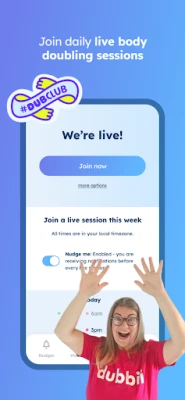 Cikin dubbii, za ka samu damar shiga zaman "body doubling" na kai tsaye da muke gudanarwa kullum don taimaka maka ka kasance da maida hankali kan aikin ka. Shiga cikin al'ummar "body-doublers" masu zumunci don wani zama mai kayatarwa kowace ranar mako, inda za ka samu kwarin gwiwa, ci gaba da maida hankali, da kuma zaburar da wasu. Bugu da kari, tsarin "Nudges" namu zai taimaka maka wajen tsarawa da tuna ayyukan yau da kullum a lokacin da ya dace. Za ka iya saita sanarwa guda daya ko masu maimaitawa don ayyukan dubbii ko kuma ka kirkiri naka. Har ma muna da yanayin "PDA mode" na musamman ga waɗanda ke guje wa buƙata – kar ka danna wannan maballin, duk abin da ka yi!