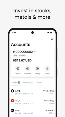 Exness Trade wata manhajar ciniki ce ta zamani da ke ba ka damar sarrafa asusunka na ciniki kai tsaye daga wayar hannunka. Ko da ba ka kusa da kwamfutarka ba, za ka iya shiga duniyar kasuwanni cikin sauƙi da ƙwarewa. Tare da Exness Trade, za ka iya yin cinikin hannun jari, zinariya, mai, fihirisa, da sauran kadarori masu yawa, duk a tafin hannunka. Karɓi mahimman sanarwa game da ma'aunin asusunka, ayyukan ciniki, da sauran mahimman bayanai domin ka kasance koyaushe a sahun gaba na ci gaban kasuwa.