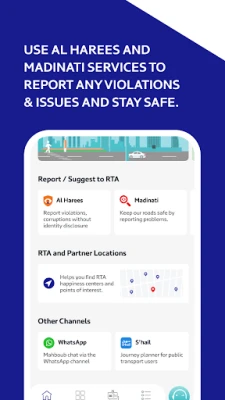 RTA Dubai kuma tana ba ka damar duba duk takardunka masu alaƙa da tuƙi a wuri guda, wanda ke kawar da buƙatar bincike. Kana iya samun taimako a kowane lokaci daga Mahboub, injin amsa tambayoyi na RTA, wanda yake shirye koyaushe don amsa tambayoyinka da taimaka maka da mu'amalarka ta RTA. Bugu da ƙari, manhajar tana nuna maka dukkan wuraren RTA, kamar cibiyoyin hidima, tashoshin Salik, rumfuna masu wayo, cibiyoyin gwajin ido, da makarantun tuƙi, don ka iya nemo mafi kusa da kai cikin sauƙi. Hakanan, za ka iya haɗa asusunka na Salik da RTA Dubai don cika shi cikin sauƙi. Tare da sabis ɗin Al Harees da Madinati, za ka iya bayar da rahoto kan duk wata take-take ko matsala don kiyaye aminci a kan hanyoyi da kuma al'umma. Wannan manhaja ce mai sauƙi, mai dacewa, kuma mai tsaro don samun damar yin amfani da dukkan ayyukanka na zirga-zirga da sufuri.
