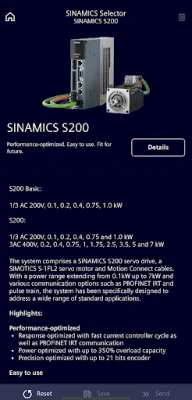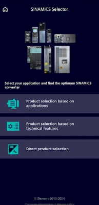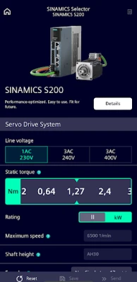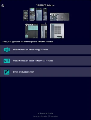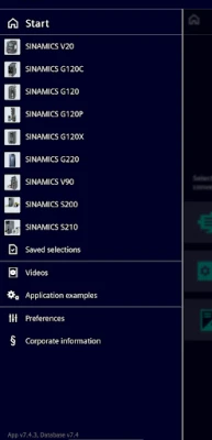 SINAMICS Selector yana sauƙaƙe zaɓin lambobin kayan aiki ga SINAMICS low-voltage converters naka cikin sauki. App ɗin yana aiki da masu juyawa mitar da servo drive systems, masu karfin wuta daga 0.12 kW zuwa 630 kW. Yana tallafawa SINAMICS V20, G120C, G120P, G120X, G120, G220, da kuma V90, S200, S210.